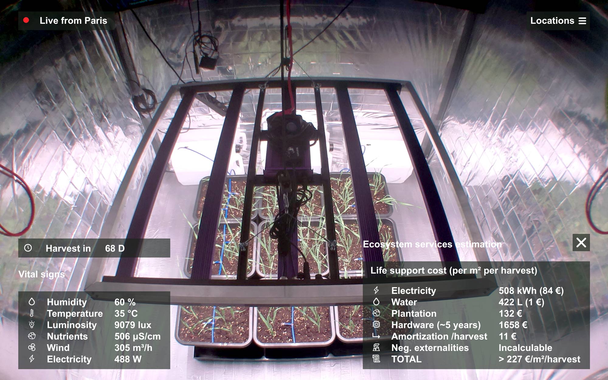 This experiment consists of 1 square meter of wheat, cultivated in a closed environment. Critical inputs such as water, light, heat, and nutrients are measured, monitored and displayed for the public. This procedure makes palpable the immense scale of ecosystem contributions, and provides a speculative reference for a reckoning of the undervalued and over-exploited “work of the biosphere.”
