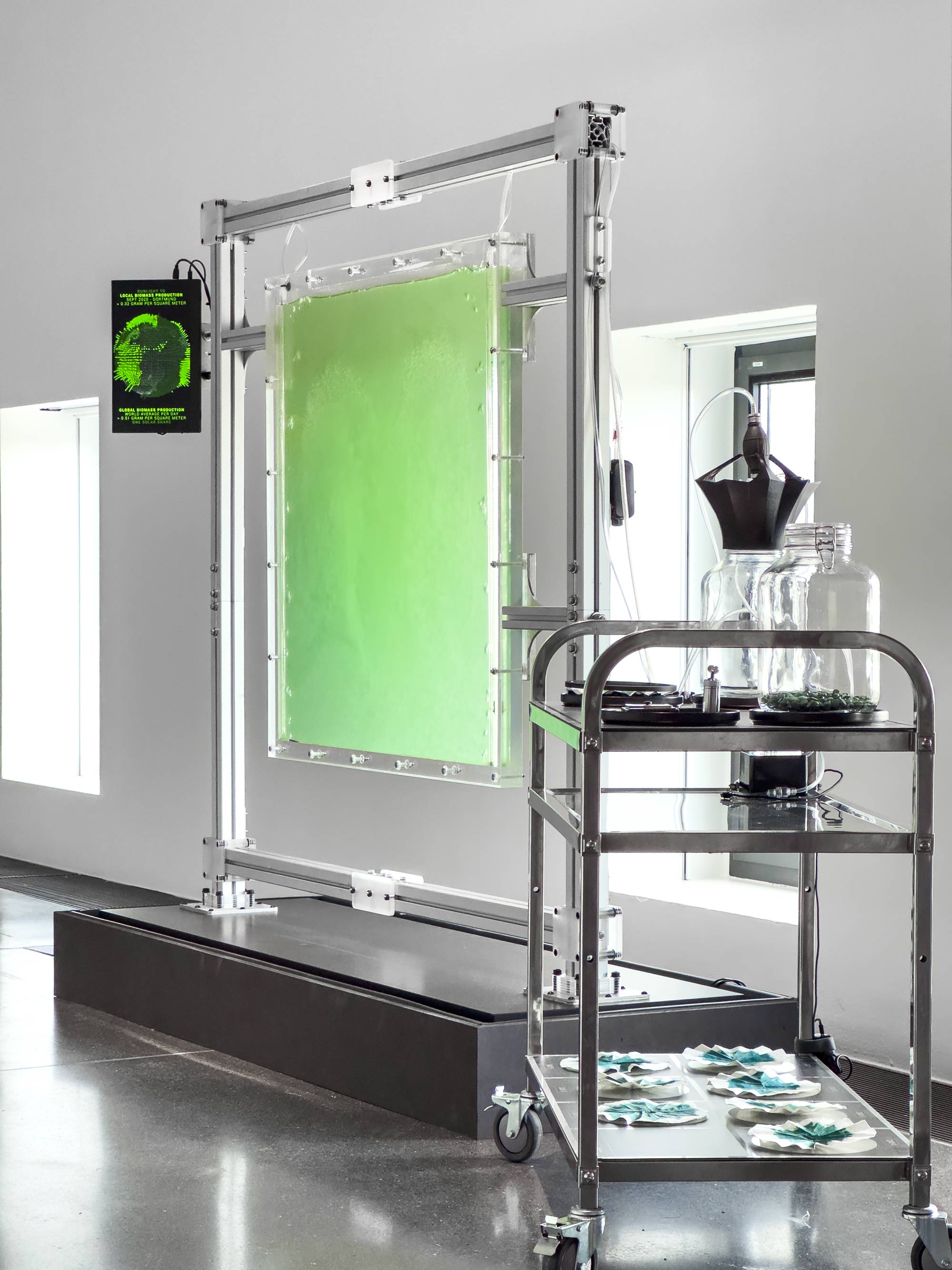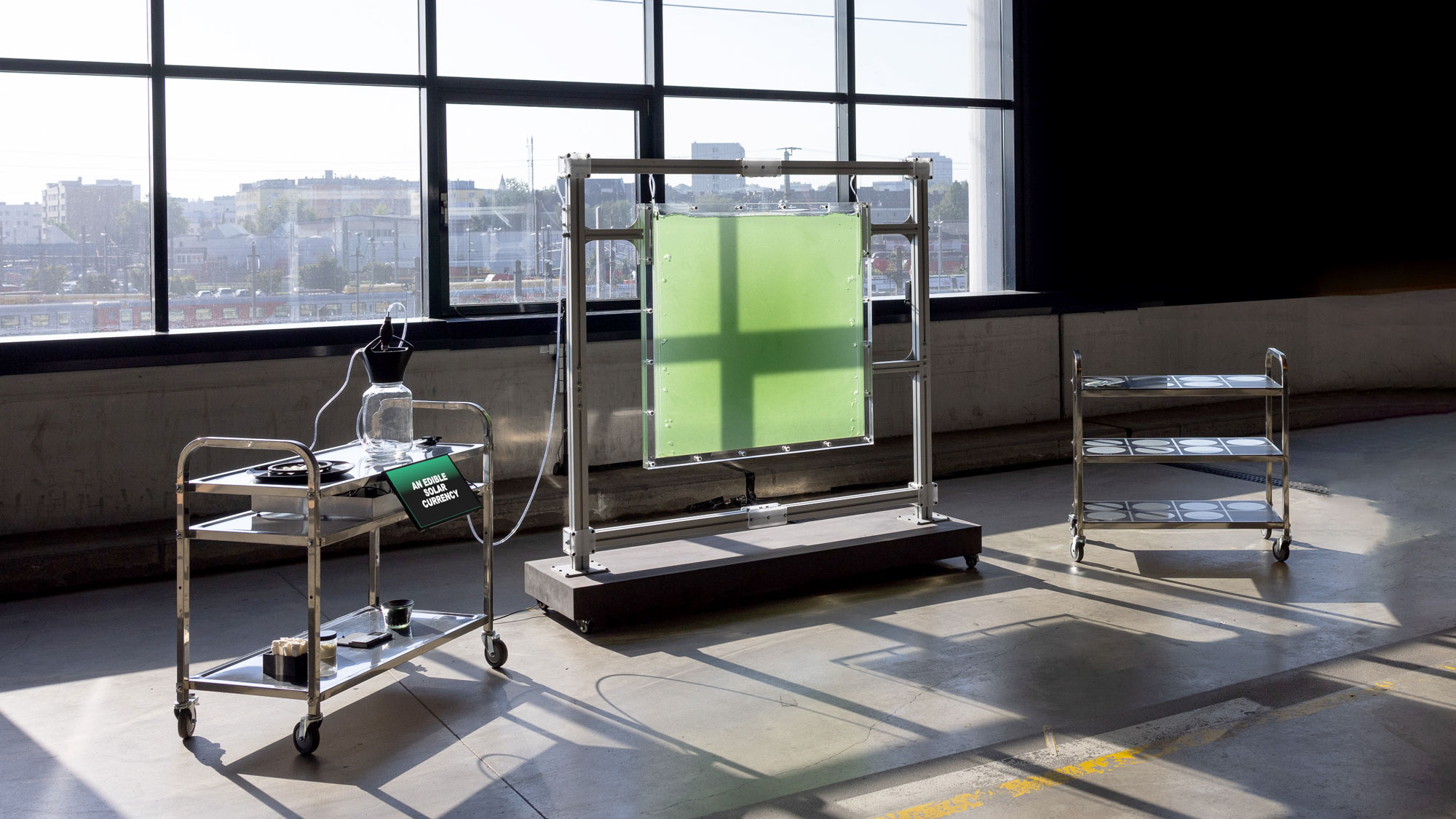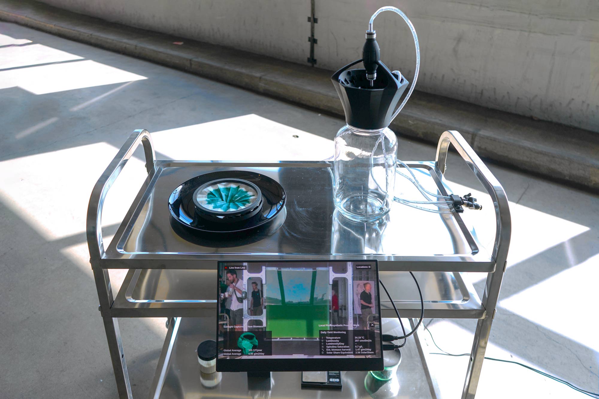 THE SOLAR SHARE stages a form of planetary economics based on photosynthesis. Every day a microalgae culture converts sunlight into edible biomass. The yield of the 1 sq.m bioreactor is a concrete means of measuring solar income—actual new energy entering the Earth’s metabolism.