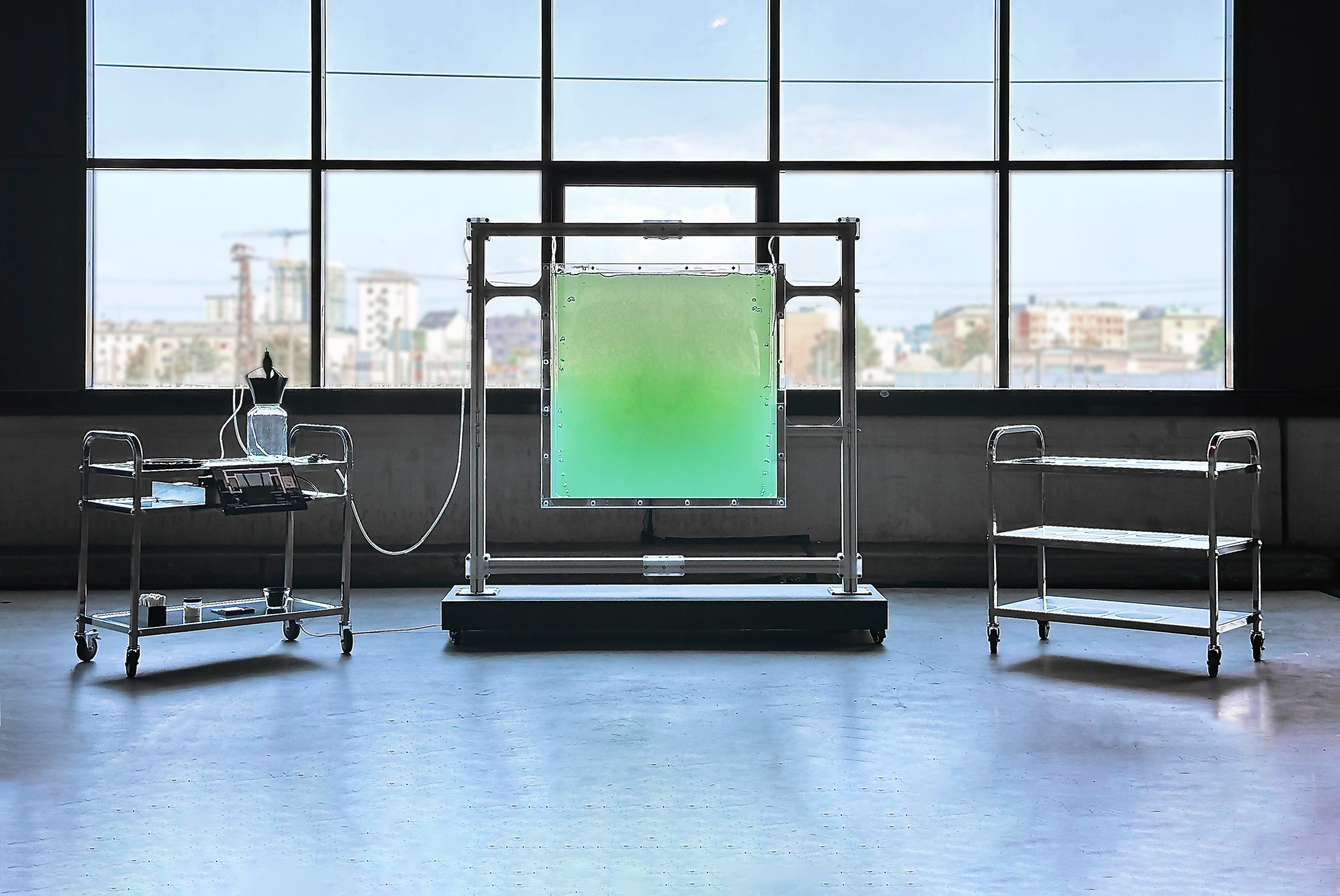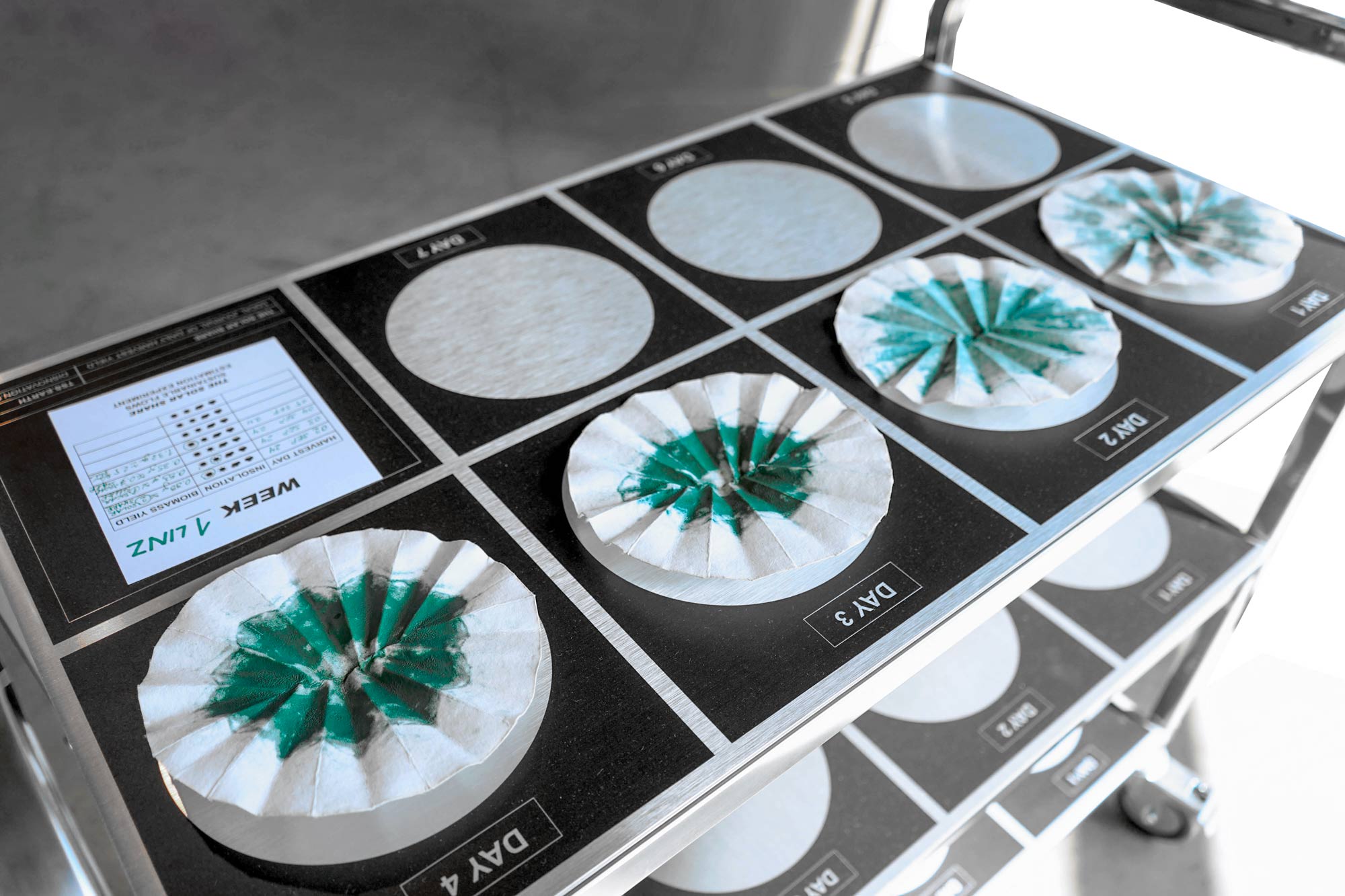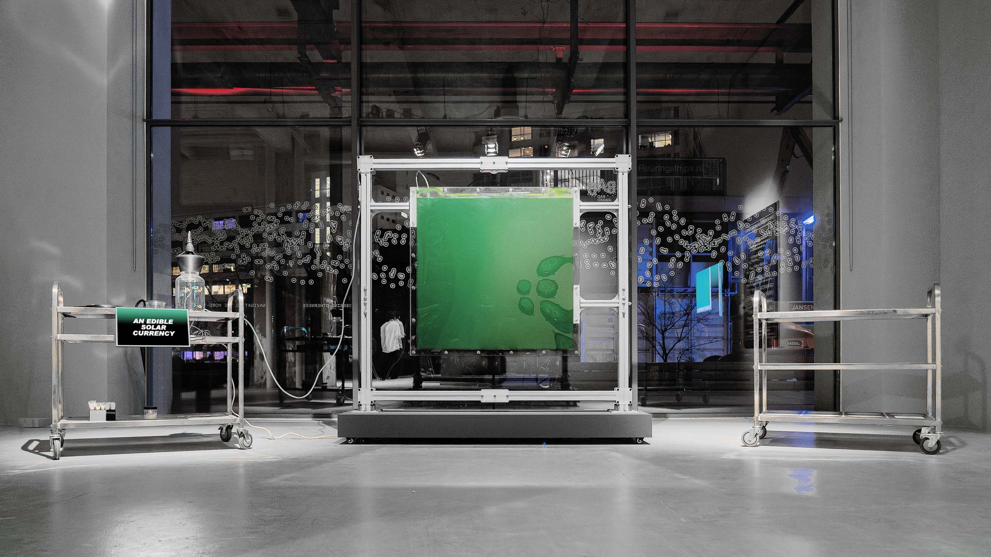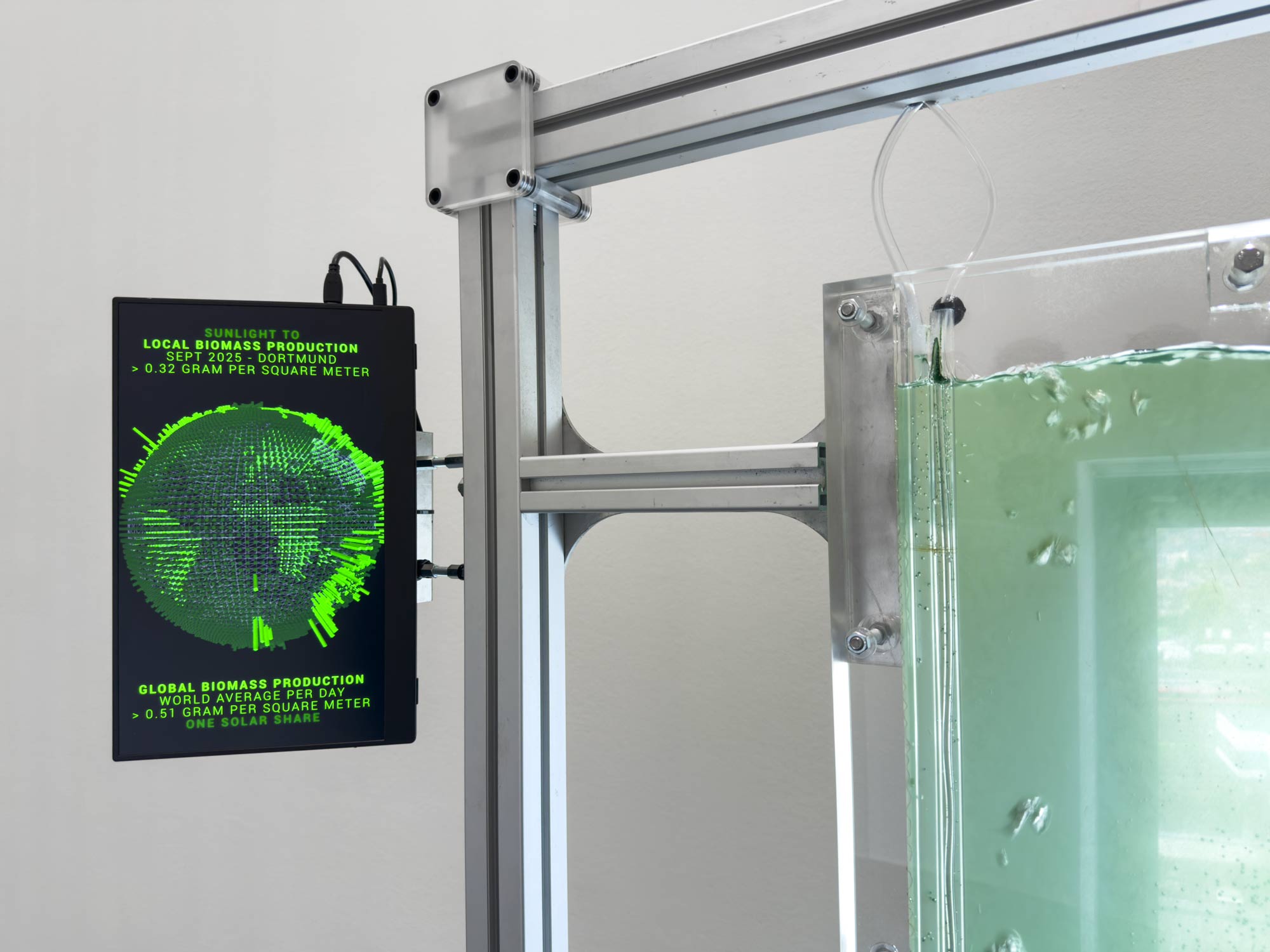 THE SOLAR SHARE stages a form of planetary economics based on photosynthesis. Every day a microalgae culture converts sunlight into edible biomass. The yield of the 1 sq.m bioreactor is a concrete means of measuring solar income—actual new energy entering the Earth’s metabolism.